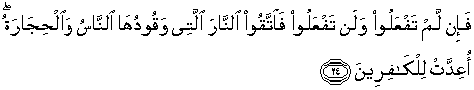 24. Maka jika kamu tidak dapat membuat(nya) - dan pasti kamu tidak akan dapat membuat(nya), peliharalah dirimu dari neraka yang bahan bakarnya manusia dan batu, yang disediakan bagi orang-orang kafir.