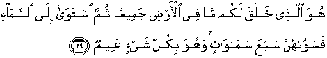 29. Dia-lah Allah, yang menjadikan segala yang ada di bumi untuk kamu dan Dia berkehendak (menciptakan) langit, lalu dijadikan-Nya tujuh langit. Dan Dia Maha Mengetahui segala sesuatu.