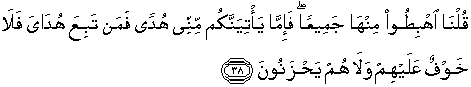 38. Kami berfirman: "Turunlah kamu semuanya dari surga itu! Kemudian jika datang petunjuk-Ku kepadamu, maka barang siapa yang mengikuti petunjuk-Ku, niscaya tidak ada kekhawatiran atas mereka, dan tidak (pula) mereka bersedih hati."