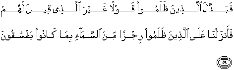 59. Lalu orang-orang yang zalim mengganti perintah dengan (mengerjakan) yang tidak diperintahkan kepada mereka. Sebab itu Kami timpakan atas orang-orang yang zalim itu dari langit, karena mereka berbuat fasik.