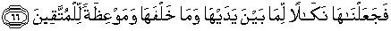 66. Maka Kami jadikan yang demikian itu peringatan bagi orang-orang dimasa itu, dan bagi mereka yang datang kemudian, serta menjadi pelajaran bagi orang-orang yang bertakwa.