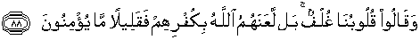 88. Dan mereka berkata: "Hati kami tertutup". Tetapi sebenarnya Allah telah mengutuk mereka karena keingkaran mereka; maka sedikit sekali mereka yang beriman.