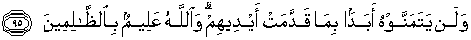 95. Dan sekali-kali mereka tidak akan mengingini kematian itu selama-lamanya, karena kesalahan-kesalahan yang telah diperbuat oleh tangan mereka (sendiri), dan Allah Maha Mengetahui siapa orang-orang yang aniaya.