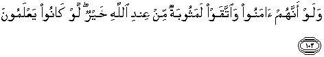 103. Sesungguhnya kalau mereka beriman dan bertakwa, (niscaya mereka akan mendapat pahala), dan sesungguhnya pahala dari sisi Allah adalah lebih baik, kalau mereka mengetahui.