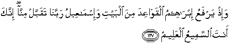 127. Dan (ingatlah), ketika Ibrahim meninggikan (membina) dasar-dasar Baitullah bersama Ismail (seraya berdoa): "Ya Tuhan kami terimalah daripada kami (amalan kami), sesungguhnya Engkaulah Yang Maha Mendengar lagi Maha Mengetahui".