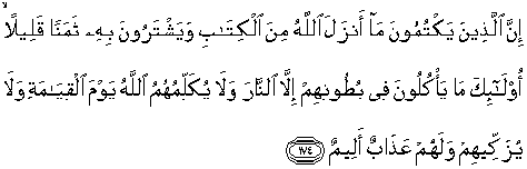 Dalam riwayat lain dikemukakan bahwa turunnya ayat ini (S. 2: 174) dalam peristiwa berikut: Pemimpin dan ulama kaum Yahudi biasa mendapat persembahan dan sanjungan rakyat bawahannya.