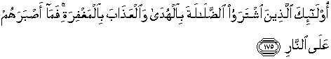 175. Mereka itulah orang-orang yang membeli kesesatan dengan petunjuk dan siksa dengan ampunan. Maka alangkah beraninya mereka menentang api neraka!