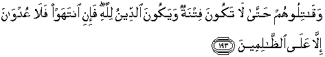 193. Dan perangilah mereka itu, sehingga tidak ada fitnah lagi dan (sehingga) ketaatan itu hanya semata-mata untuk Allah. Jika mereka berhenti (dari memusuhi kamu), maka tidak ada permusuhan (lagi), kecuali terhadap orang-orang yang zalim.