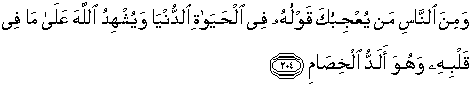 204. Dan di antara manusia ada orang yang ucapannya tentang kehidupan dunia menarik hatimu, dan dipersaksikannya kepada Allah (atas kebenaran) isi hatinya, padahal ia adalah penantang yang paling keras.