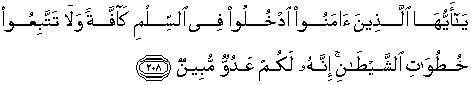208. Hai orang-orang yang beriman, masuklah kamu ke dalam Islam keseluruhan, dan janganlah kamu turut langkah-langkah syaitan. Sesungguhnya syaitan itu musuh yang nyata bagimu.