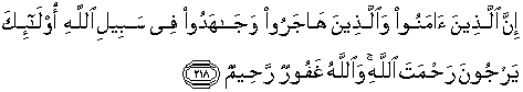 218. Sesungguhnya orang-orang yang beriman, orang-orang yang berhijrah dan berjihad di jalan Allah, mereka itu mengharapkan rahmat Allah, dan Allah Maha Pengampun lagi Maha Penyayang.