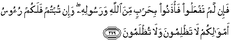 279. Maka jika kamu tidak mengerjakan (meninggalkan sisa riba), maka ketahuilah, bahwa Allah dan Rasul-Nya akan memerangimu. Dan jika kamu bertaubat (dari pengambilan riba), maka bagimu pokok hartamu; kamu tidak menganiaya dan tidak (pula) dianiaya.