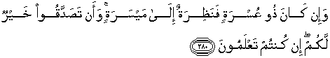 280. Dan jika (orang yang berhutang itu) dalam kesukaran, maka berilah tangguh sampai dia berkelapangan. Dan menyedekahkan (sebagian atau semua utang) itu, lebih baik bagimu, jika kamu mengetahui.