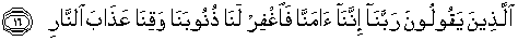 16. (Yaitu) orang-orang yang berdoa: Ya Tuhan kami, sesungguhnya kami telah beriman, maka ampunilah segala dosa kami dan peliharalah kami dari siksa neraka,"
