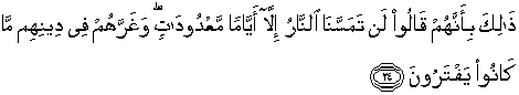 24. Hal itu adalah karena mereka mengaku: "Kami tidak akan disentuh oleh api neraka kecuali beberapa hari yang dapat dihitung." Mereka diperdayakan dalam agama mereka oleh apa yang selalu mereka ada-adakan.