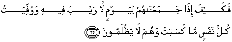 25. Bagaimanakah nanti apabila mereka Kami kumpulkan di hari (kiamat) yang tidak ada keraguan tentang adanya. Dan disempurnakan kepada tiap-tiap diri balasan apa yang diusahakannya sedang mereka tidak dianiaya (dirugikan).
