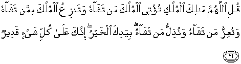 26. Katakanlah: "Wahai Tuhan Yang mempunyai kerajaan, Engkau