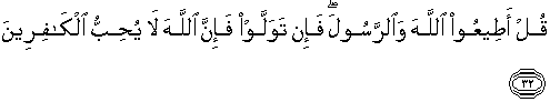 32. Katakanlah: "Ta'atilah Allah dan Rasul-Nya; jika kamu berpaling, maka sesungguhnya Allah tidak menyukai orang-orang kafir."