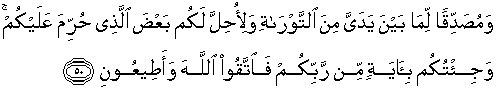 50. Dan (aku datang kepadamu) membenarkan Taurat yang datang
