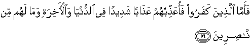 56. Adapun orang-orang yang kafir, maka akan Ku-siksa mereka dengan siksa yang sangat keras di dunia dan di akhirat, dan mereka tidak memperoleh penolong.