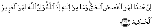 62. Sesungguhnya ini adalah kisah yang benar, dan tak ada Tuhan (yang berhak disembah) selain Allah; dan sesungguhnya Allah, Dialah Yang Maha Perkasa lagi Maha Bijaksana .