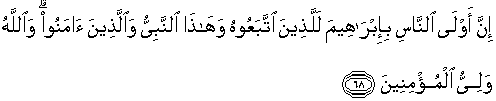 68. Sesungguhnya orang yang paling dekat kepada Ibrahim ialah orang-orang yang mengikutinya dan Nabi ini (Muhammad), beserta orang-orang yang beriman (kepada Muhammad), dan Allah adalah Pelindung semua orang-orang yang beriman.