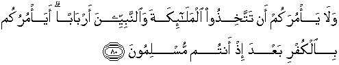 80. dan (tidak wajar pula baginya) menyuruhmu menjadikan malaikat dan para nabi sebagai tuhan. Apakah (patut) dia menyuruhmu berbuat kekafiran di waktu kamu sudah (menganut agama) Islam?."