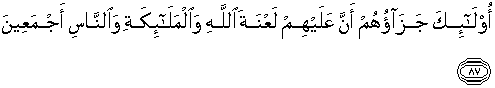 87. Mereka itu, balasannya ialah: bahwasanya la'nat Allah ditimpakan kepada mereka, (demikian pula) la'nat para malaikat dan manusia seluruhnya,