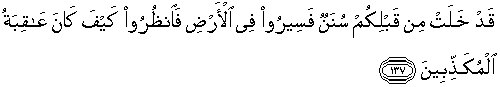 137. Sesungguhnya telah berlalu sebelum kamu sunnah-sunnah Allah[230]; Karena itu berjalanlah kamu di muka bumi dan