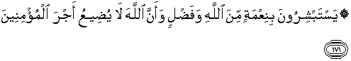 171. Mereka bergirang hati dengan nikmat dan karunia yang yang besar dari Allah, dan bahwa Allah tidak menyia-nyiakan pahala orang-orang yang beriman.