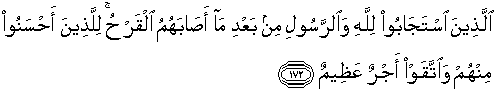 172. (Yaitu) orang-orang yang mentaati perintah Allah dan Rasul-Nya sesudah mereka mendapat luka (dalam peperangan Uhud). Bagi orang-orang yang berbuat kebaikan diantara mereka dan yang bertakwa ada pahala yang besar.
