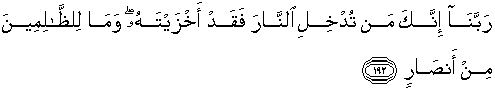 192. Ya Tuhan kami, sesungguhnya barangsiapa yang Engkau masukkan ke dalam neraka, maka sungguh telah Engkau hinakan ia, dan tidak ada bagi orang-orang yang zalim seorang penolongpun.