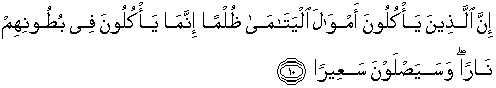 10. Sesungguhnya orang-orang yang memakan harta anak yatim secara zalim, sebenarnya mereka itu menelan api sepenuh perutnya dan mereka akan masuk ke dalam api yang menyala-nyala (neraka).