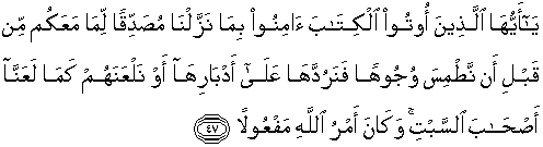 47. Hai orang-orang yang telah diberi Al Kitab, berimanlah kamu kepada