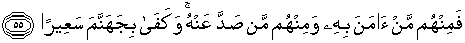 55. Maka di antara mereka (orang-orang yang dengki itu), ada orang-orang yang beriman kepadanya, dan di antara mereka ada orang-orang yang menghalangi (manusia) dari beriman kepadanya. Dan cukuplah (bagi mereka) Jahannam yang menyala-nyala apinya.