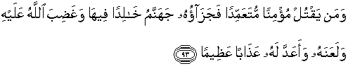 93. Dan barangsiapa yang membunuh seorang mukmin dengan sengaja maka balasannya ialah Jahannam, kekal ia di dalamnya dan Allah murka kepadanya, dan mengutukinya serta menyediakan azab yang besar baginya.