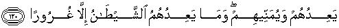 120. Syaitan itu memberikan janji-janji kepada mereka dan membangkitkan angan-angan kosong pada mereka, padahal syaitan itu tidak menjanjikan kepada mereka selain dari tipuan belaka.