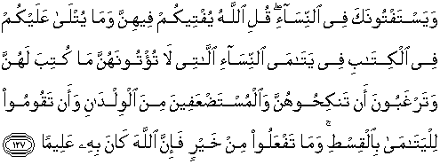 [354]. Lihat surat An Nisaa' ayat 2 dan 3 [355] Maksudnya ialah: pusaka dan maskawin. [356]. Menurut adat Arab Jahiliyah seorang wali berkuasa atas wanita yatim yang dalam asuhannya dan berkuasa akan hartanya. Jika wanita yatim itu cantik dikawini dan diambil hartanya. Jika wanita itu buruk rupanya, dihalanginya kawin dengan laki-laki yang lain supaya dia tetap dapat menguasai hartanya. Kebiasaan di atas dilarang melakukannya oleh ayat ini.