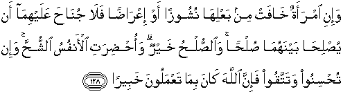 menggaulinya dan tidak mau memberikan haknya. [358]. Seperti isteri bersedia beberapa haknya dikurangi asal suaminya mau baik kembali. [359]. Maksudnya: tabi'at manusia itu tidak mau melepaskan sebahagian haknya kepada orang lain dengan seikhlas hatinya, kendatipun demikian jika isteri melepaskan sebahagian hak-haknya, maka boleh suami menerimanya.