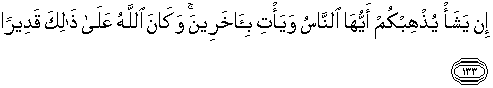 133. Jika Allah menghendaki, niscaya Dia musnahkan kamu wahai manusia, dan Dia datangkan umat yang lain (sebagai penggantimu). Dan adalah Allah Maha Kuasa berbuat demikian.