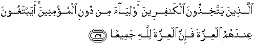 139. (yaitu) orang-orang yang mengambil orang-orang kafir menjadi teman-teman penolong dengan meninggalkan orang-orang mukmin. Apakah mereka mencari kekuatan di sisi orang kafir itu? Maka sesungguhnya semua kekuatan kepunyaan Allah.