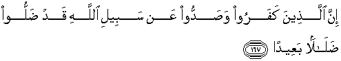167. Sesungguhnya orang-orang yang kafir dan menghalang-halangi (manusia) dari jalan Allah, benar-benar telah sesat sejauh-jauhnya.