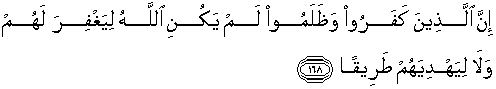 168. Sesungguhnya orang-orang yang kafir dan melakukan kezaliman, Allah sekali-kali tidak akan mengampuni (dosa) mereka dan tidak (pula) akan menunjukkan jalan kepada mereka,