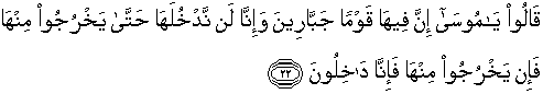 22. Mereka berkata: "Hai Musa, sesungguhnya dalam negeri itu ada orang-orang yang gagah perkasa, sesungguhnya kami sekali-kali tidak akan memasukinya sebelum mereka ke luar daripadanya. Jika mereka ke luar daripadanya, pasti kami akan memasukinya."