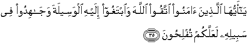 35. Hai orang-orang yang beriman, bertakwalah kepada Allah dan carilah jalan yang mendekatkan diri kepada-Nya, dan berjihadlah pada jalan-Nya, supaya kamu mendapat keberuntungan.