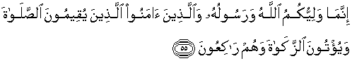 55. Sesungguhnya penolong kamu hanyalah Allah, Rasul-Nya, dan orang-orang yang beriman, yang mendirikan shalat dan menunaikan zakat, seraya mereka tunduk (kepada Allah).