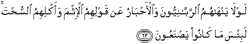 63. Mengapa orang-orang alim mereka, pendeta-pendeta mereka tidak melarang mereka mengucapkan perkataan bohong dan memakan yang haram? Sesungguhnya amat buruk apa yang telah mereka kerjakan itu.