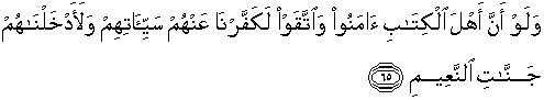 65. Dan sekiranya Ahli Kitab beriman dan bertakwa, tentulah Kami tutup (hapus) kesalahan-kesalahan mereka dan tentulah Kami masukkan mereka kedalam surga-surga yang penuh kenikmatan.