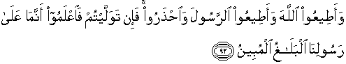 92. Dan taatlah kamu kepada Allah dan taatlah kamu kepada Rasul-(Nya) dan berhati-hatilah. Jika kamu berpaling, maka ketahuilah bahwa sesungguhnya kewajiban Rasul Kami, hanyalah menyampaikan (amanat Allah) dengan terang.