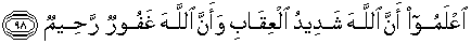 98. Ketahuilah, bahwa sesungguhnya Allah amat berat siksa-Nya dan bahwa sesungguhnya Allah Maha Pengampun lagi Maha Penyayang.